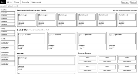 Before moving into visual design, I built low-fidelity wireframes to test the core structural changes to Steam's homepage and store experience. The wireframes focused on two things: establishing a clear information hierarchy that deprioritised promotional content, and surfacing accessibility controls as a first-class feature rather than a buried setting. The key decisions captured at this stage: